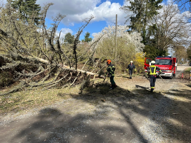 Zwei umgestürzte Bäume von einem Privatgrundstück ragten in den öffentlichen Bereich der Gladowshöher Mittelstraße und zerrissen beim Fallen die Oberleitung der Straßenbeleuchtungsanlage. Die Bäume wurden zurückgeschnitten. Um die beschädigte Freileitung kümmerte sich der Havariedienst.