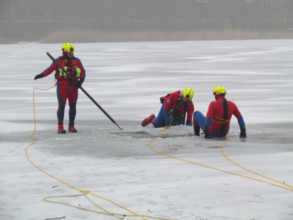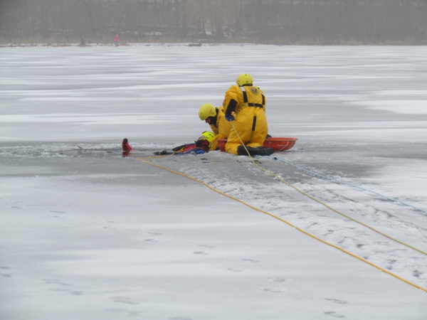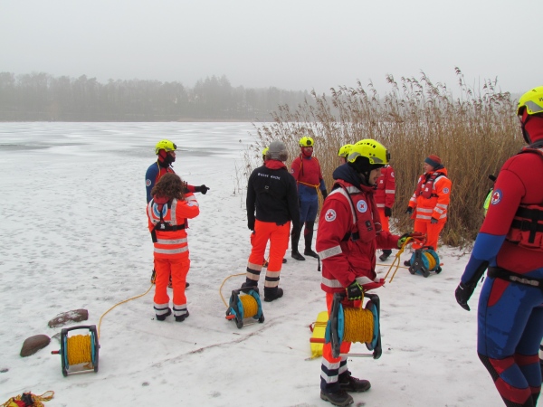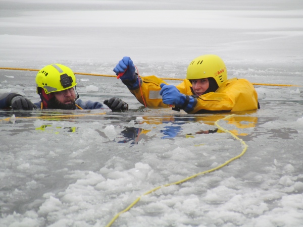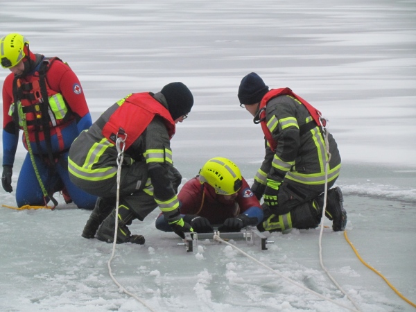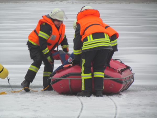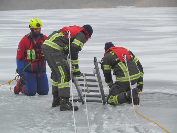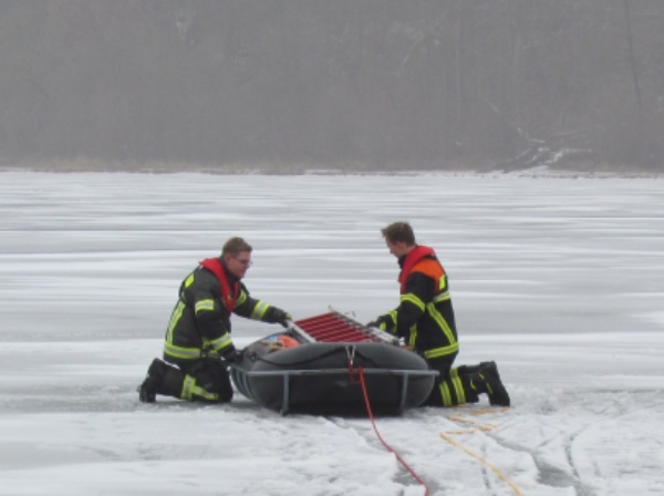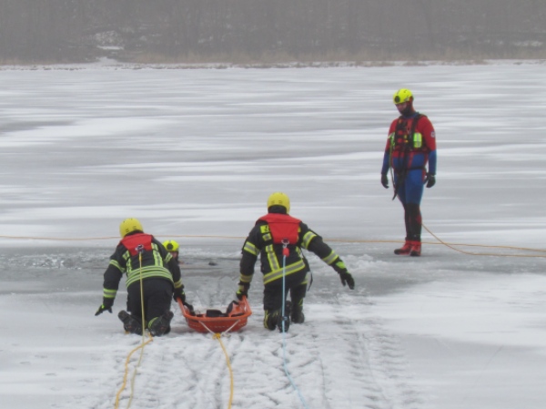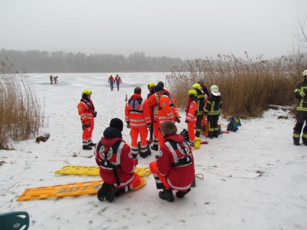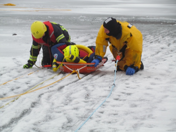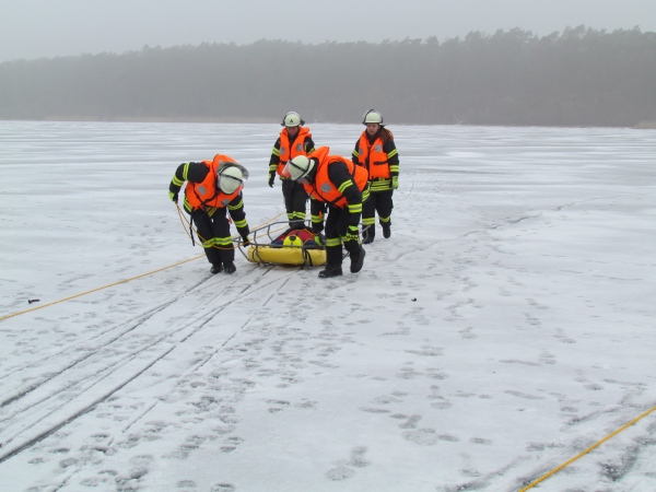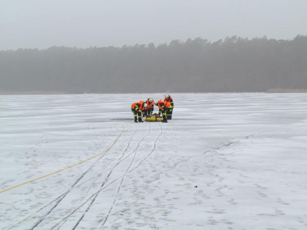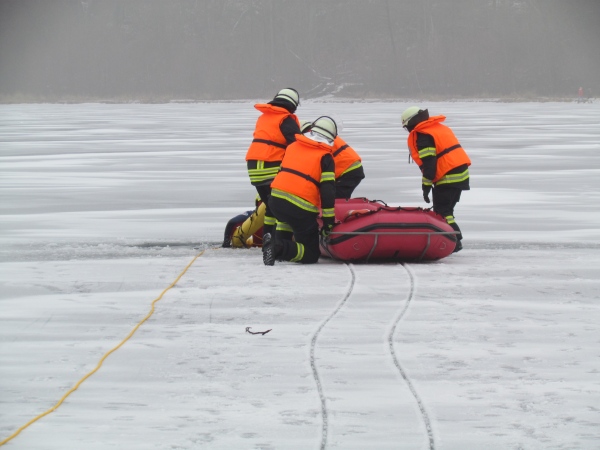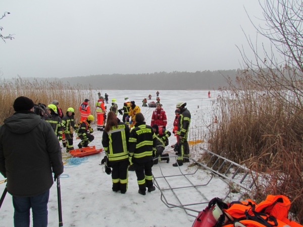 Gute zwei Stunden hatten die Kameraden die Möglichkeit, mit den vorhandenen Mitteln ihrer Ausrüstung und Ausstattung und unter realen Bedingungen, das Retten von Personen aus dem Eis zu trainieren und zu üben. Es wurden Erkenntnisse gewonnen und es erfolgte ein reger Erfahrungsaustausch unter den Teilnehmern.