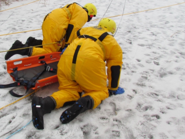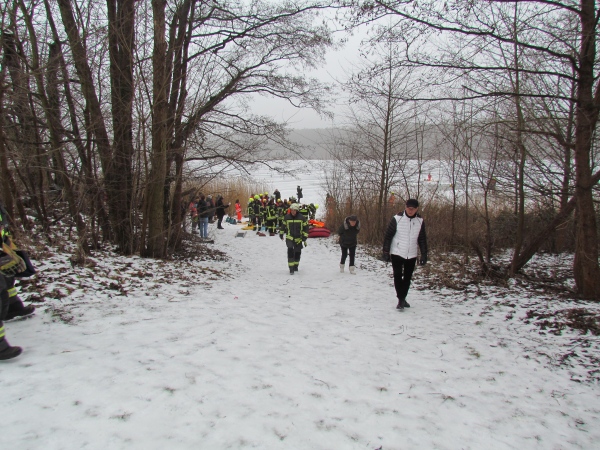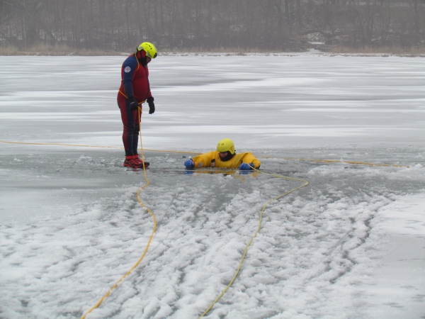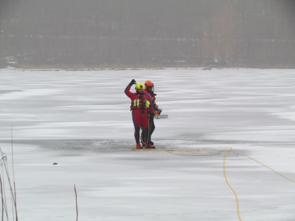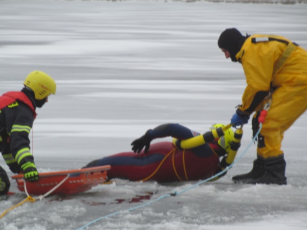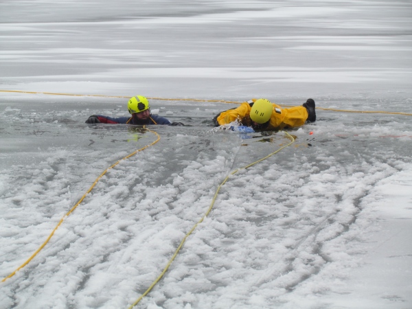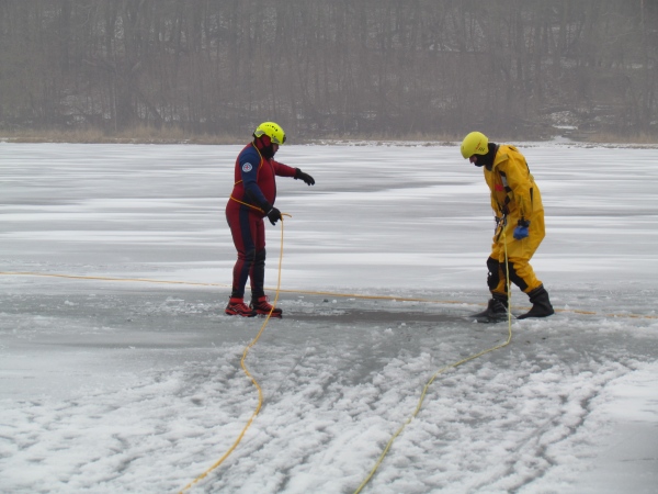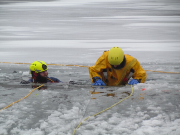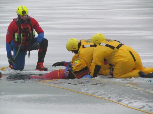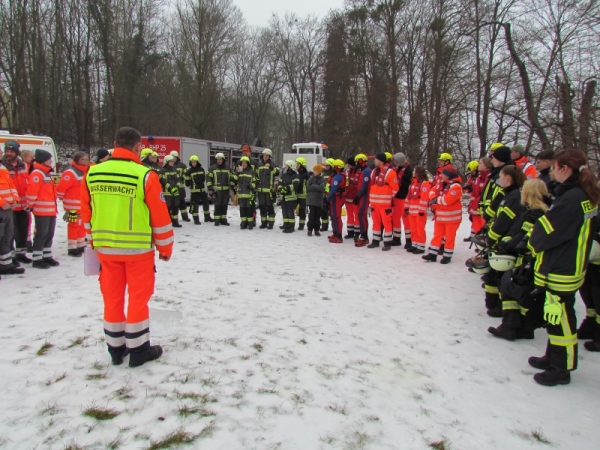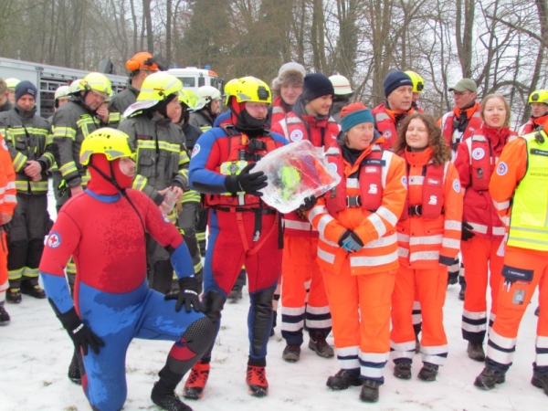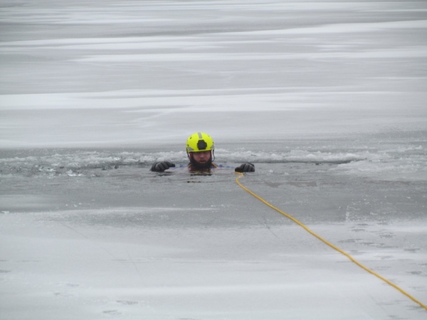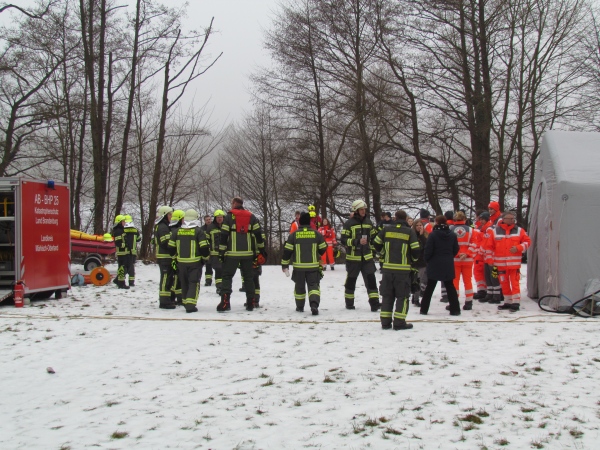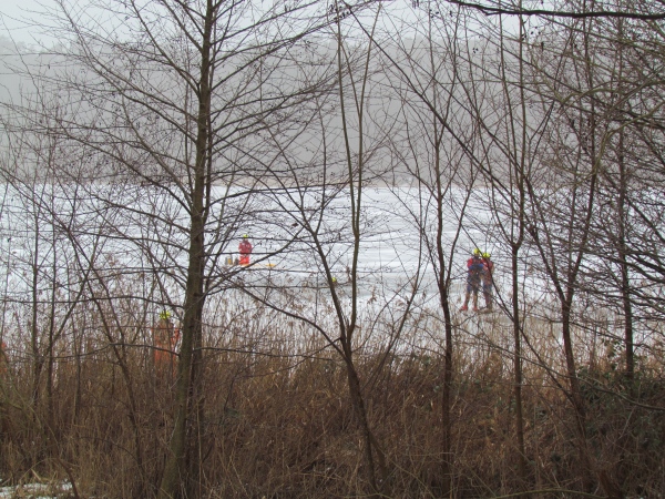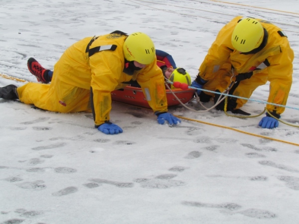 Gute zwei Stunden hatten die Kameraden die Möglichkeit, mit den vorhandenen Mitteln ihrer Ausrüstung und Ausstattung und unter realen Bedingungen, das Retten von Personen aus dem Eis zu trainieren und zu üben. Es wurden Erkenntnisse gewonnen und es erfolgte ein reger Erfahrungsaustausch unter den Teilnehmern.